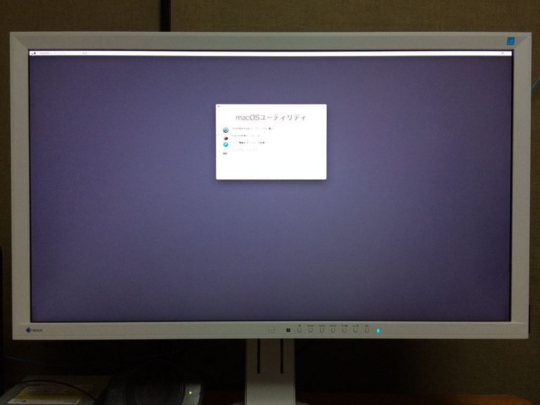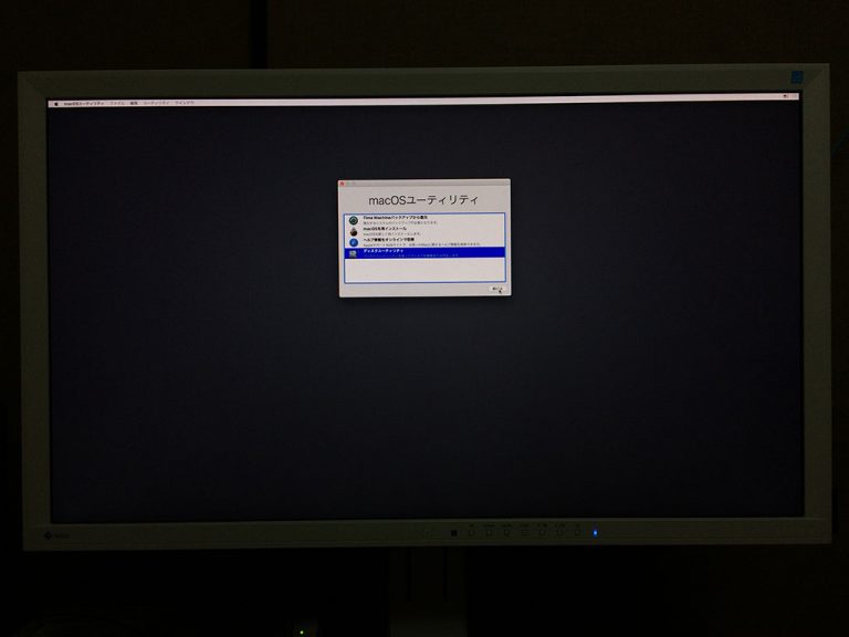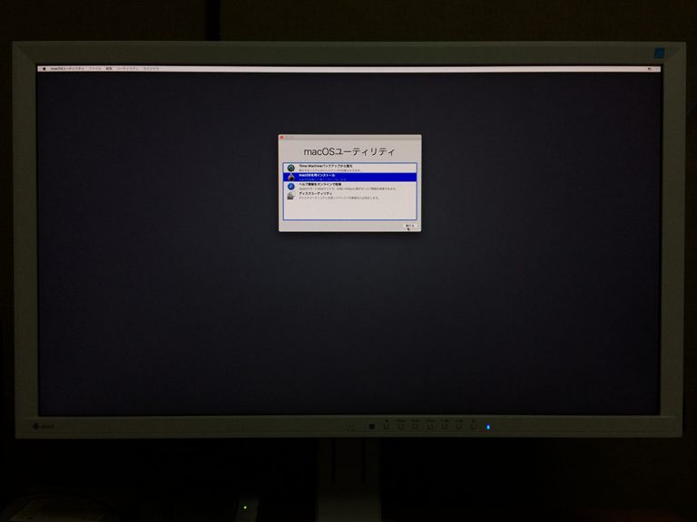 1. [command] + [option] + [R]を同時に押したまま電源を入れ「macOSの復元」を起動します。キーは本来は電源を入れた直後に押すのですが、もたついていると普通に起動してしまいます。最初から押したままが無難です。